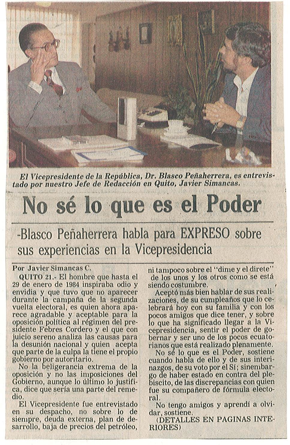 El hombre que hasta el 29 de enero de 1984 inspiraba odio y envidia y que tuvo que no "asomar" durante la campaña de la segunda vuelta electoral, es quien ahora aparece agradable y aceptable para la oposición política al régimen del Presidente Febres Cordero y que con juicio sereno analiza las causas para la desunión nacional y quien acepta que parte de la culpa la tienen el propio Gobierno, por autoritario.