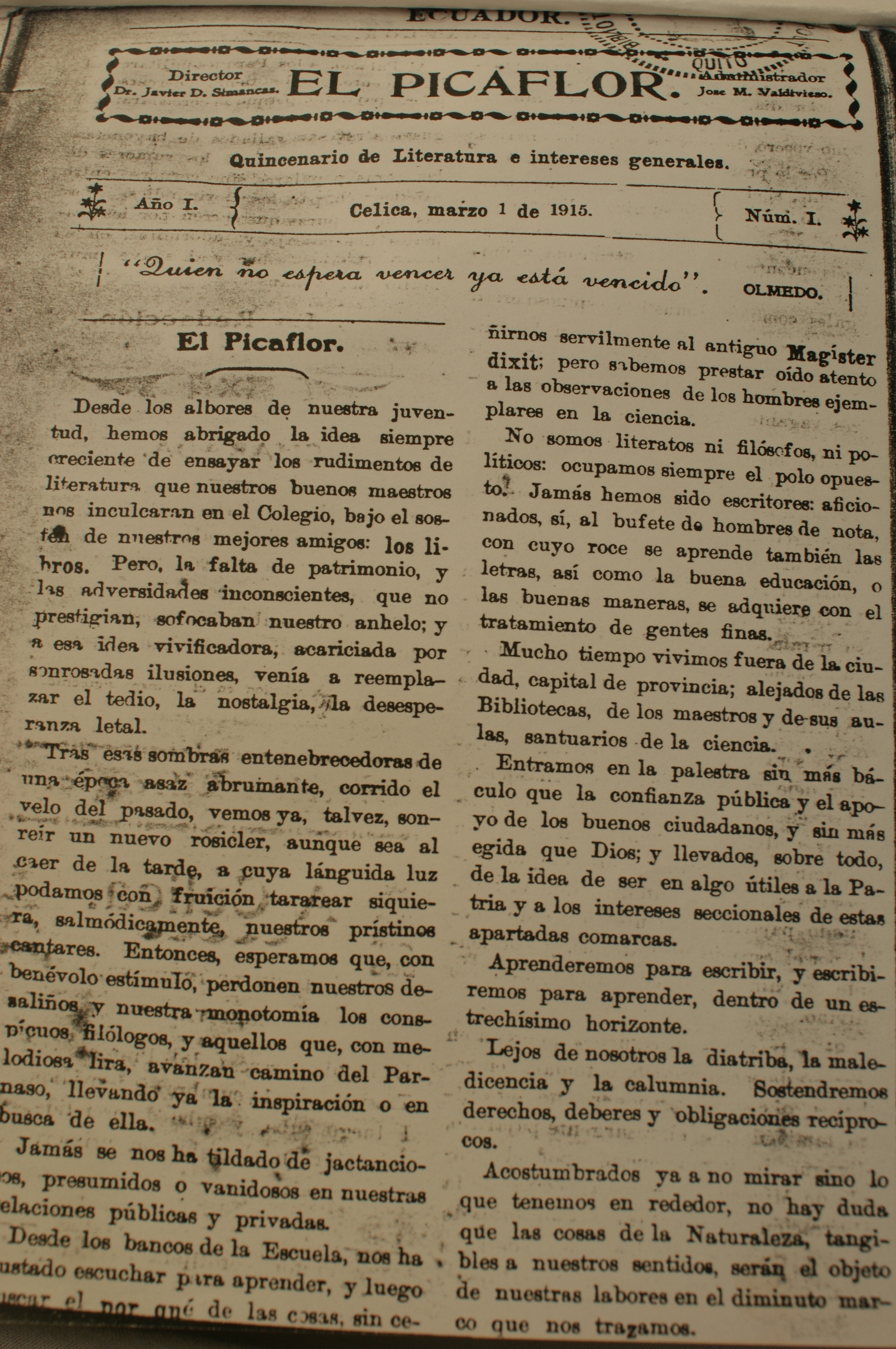 LOJA ( Agencia ANE)._ "El Picaflor", primer periódico provincial de Loja, apareció por primera vez, el 1 de marzo de 1915 en la ciudad de Celica. Su fundador y director fue el Dr. Javier Drausin Simancas, quien además de periodista fue poeta, profesor y uno de los primeros Secretarios del Colegio Bernardo Valdivieso.